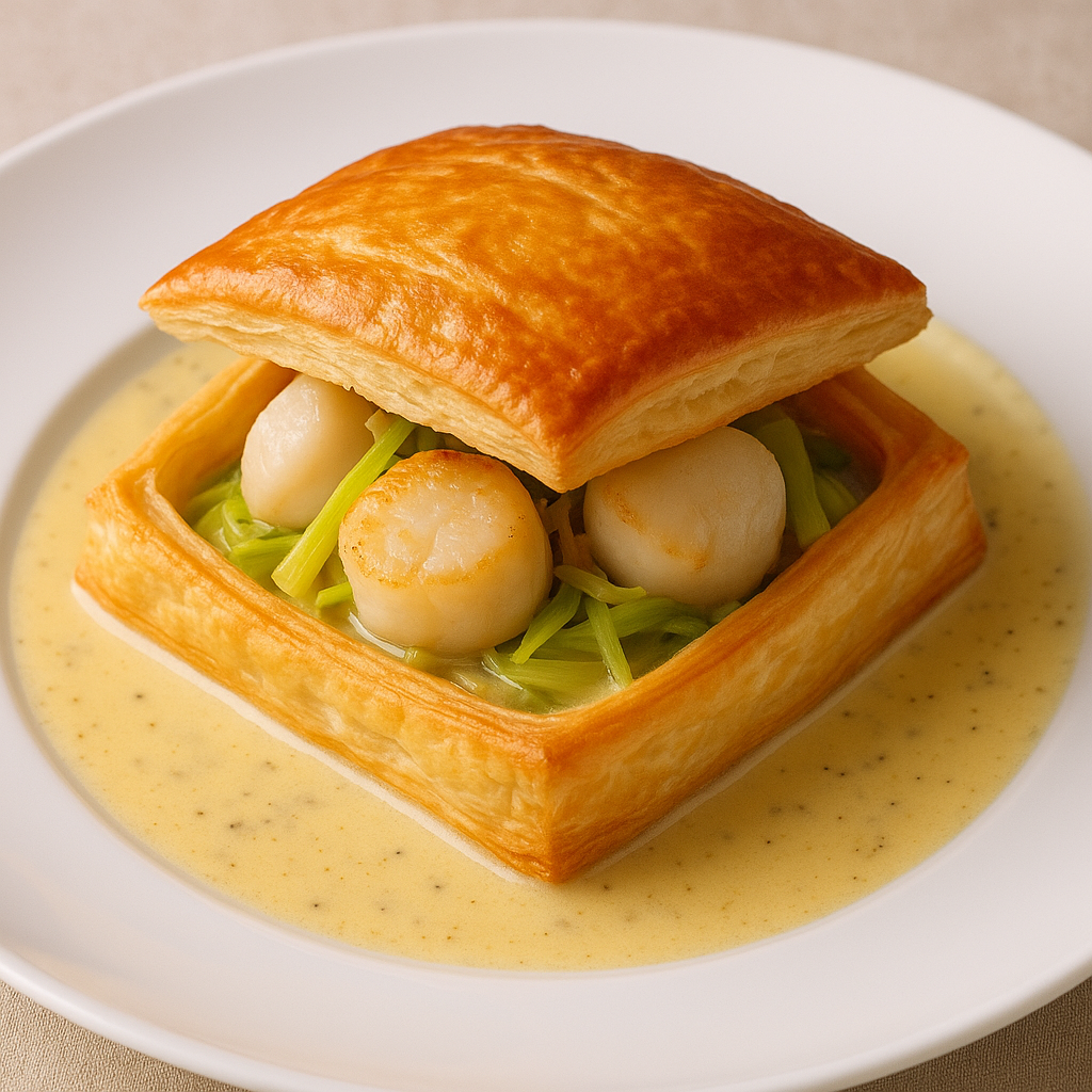 - Cut the puff pastry squares in half. Fill the bottoms with the julienned leeks and then place 6 scallop halves on top. Cover with the pastry tops.